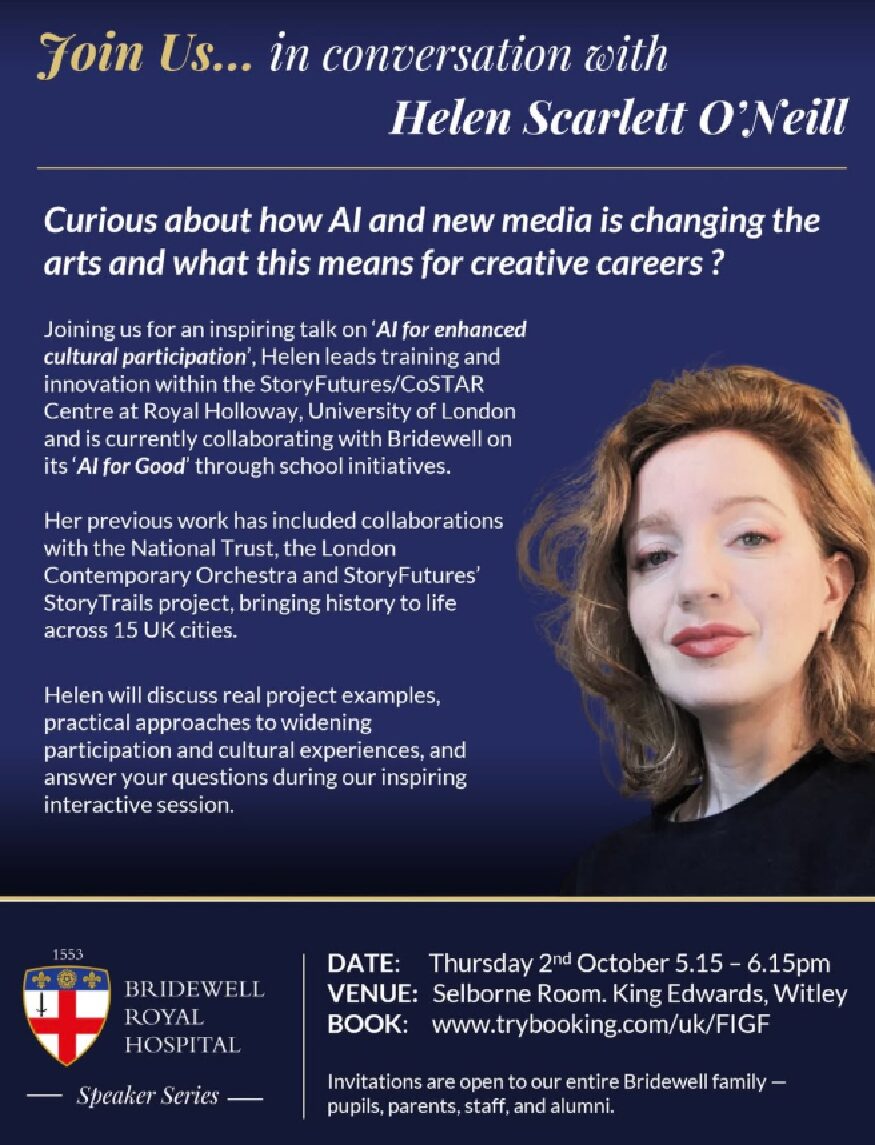 Helen leads training and innovation within the StoryFutures/COSTAR Centre at Royal Holloway, University of London and will be talking about ‘AI for enhanced cultural participation’