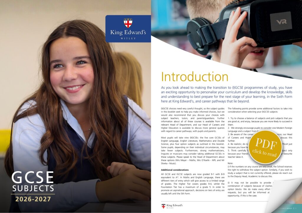 As our pupils look ahead to their GCSE programmes, they are able to personalise their curriculum and further develop their knowledge, skills and understanding in their preferred areas. Individualised support is provided, with our subject guides aiming to provide information to allow informed choices, in collaboration with teachers, tutors, the Head of Careers and Higher Education, and parents and guardians.